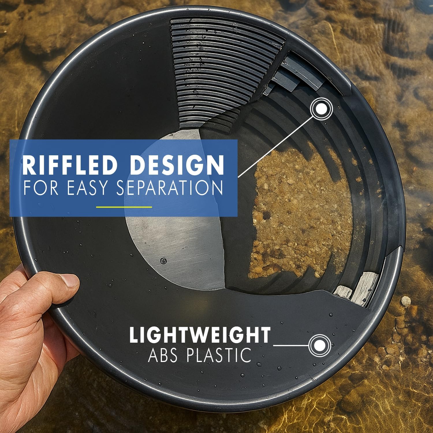 - DEEP RIFFLES FOR SUPERIOR GOLD TRAPPING – Molded deep rifles help capture fine gold, flakes, and nuggets; improves gold recovery and separation efficiency during panning; trusted by both beginner and expert prospectors.